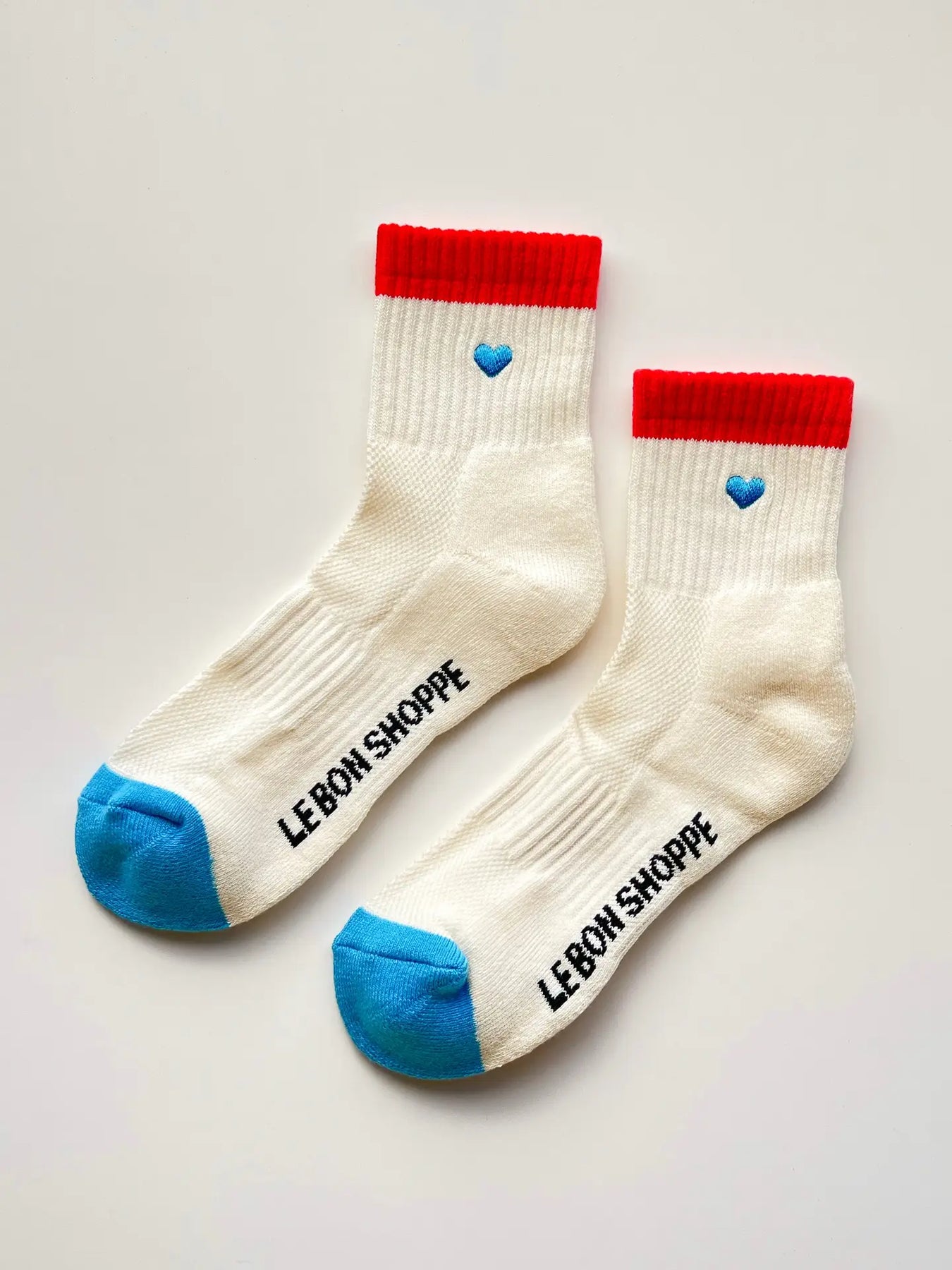 A playful take on Le Bon Shoppe's best-selling Girlfriend Socks. Designed with a color-blocked ankle, contrast toe and heel, and a charming embroidered motif at the ankle for a sweet touch. Easy to style with sandals or sneakers for everyday wear.