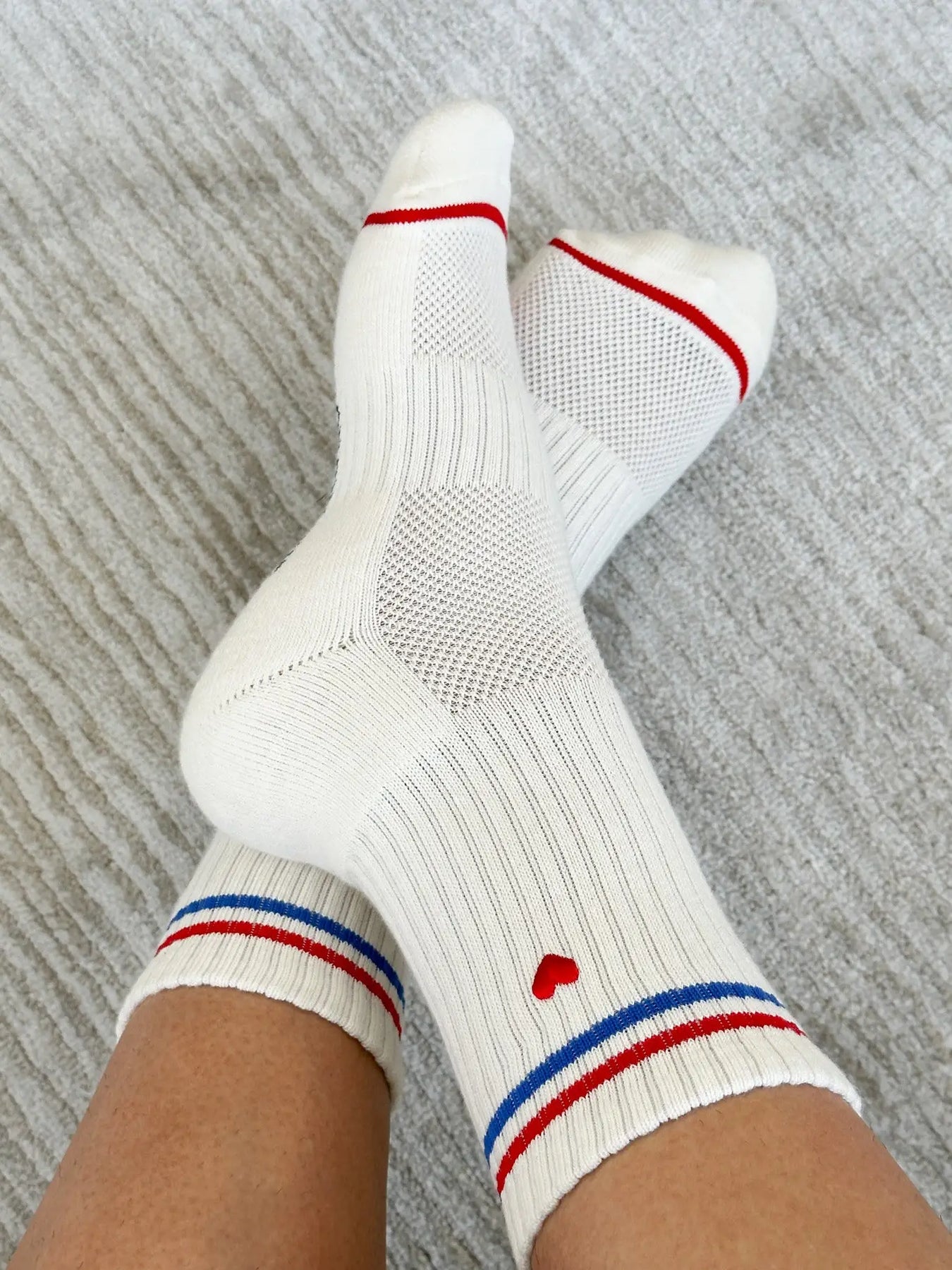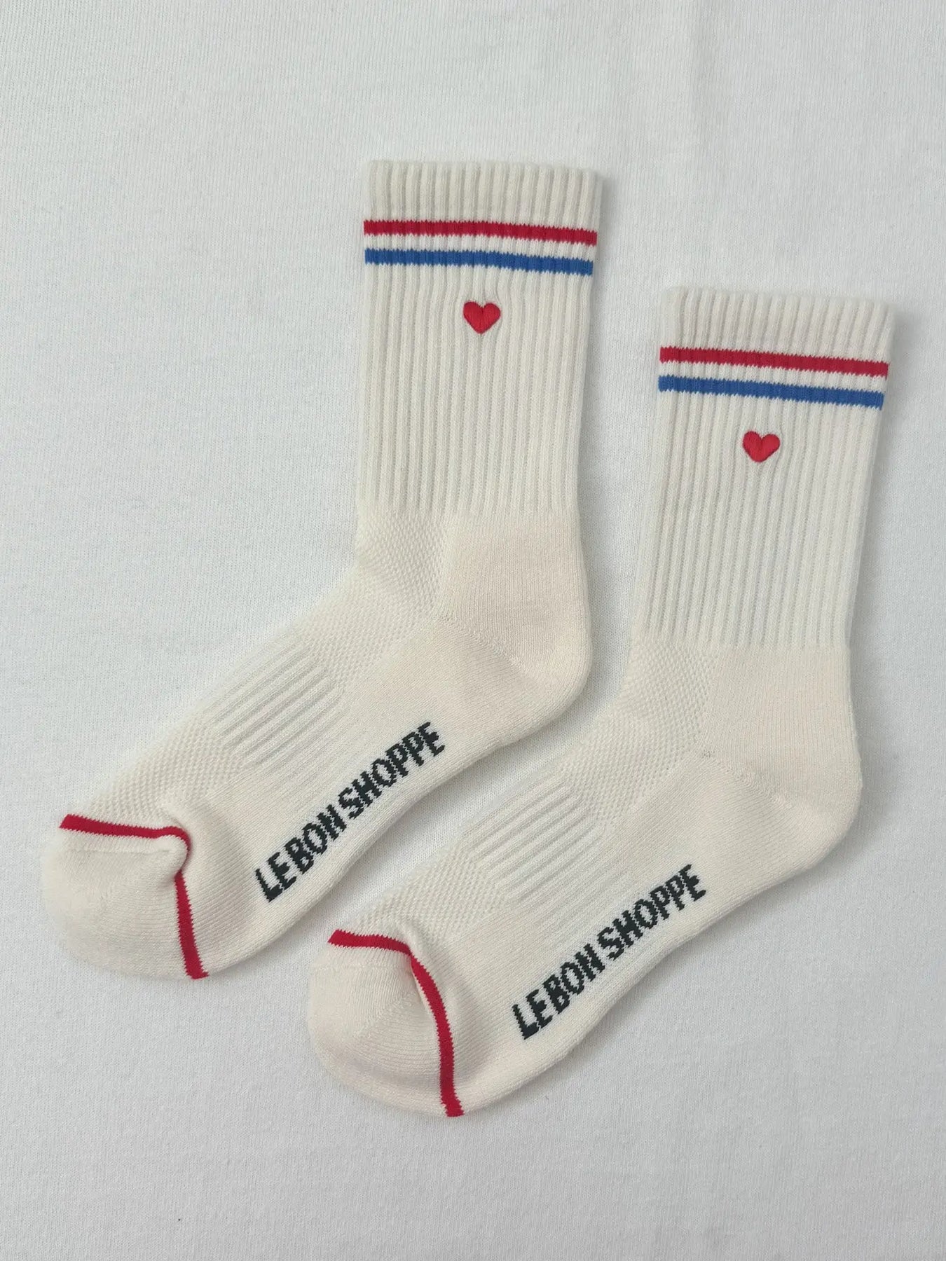 The classic Boyfriend socks you know and love, now with a little extra love. This year-round best seller maintains the perfect mix of function and fashion, creating an effortless sporty vintage charm to any outfit. It's slightly longer than a classic crew and has a contrast double stripe. A fun, embroidered heart sits just below the stripes for an endearing touch, making them the perfect pair to gift or soak up all the love in yourself.