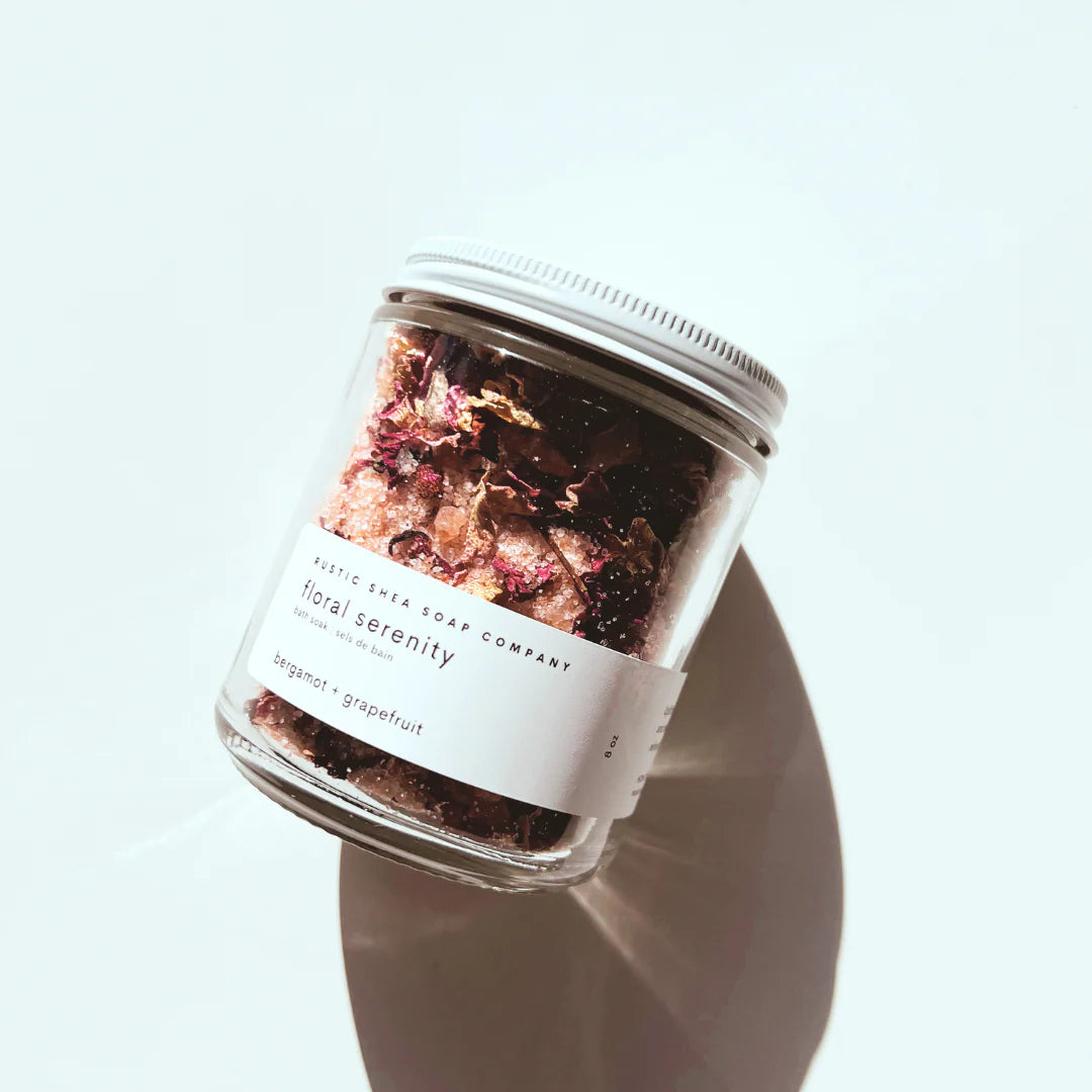 Indulge in the soothing embrace of our floral serenity bath soak, crafted with the finest Himalayan salt, infused with a refreshing citrus blend of essential oils, and delicately adorned with rose petals and hibiscus flowers.