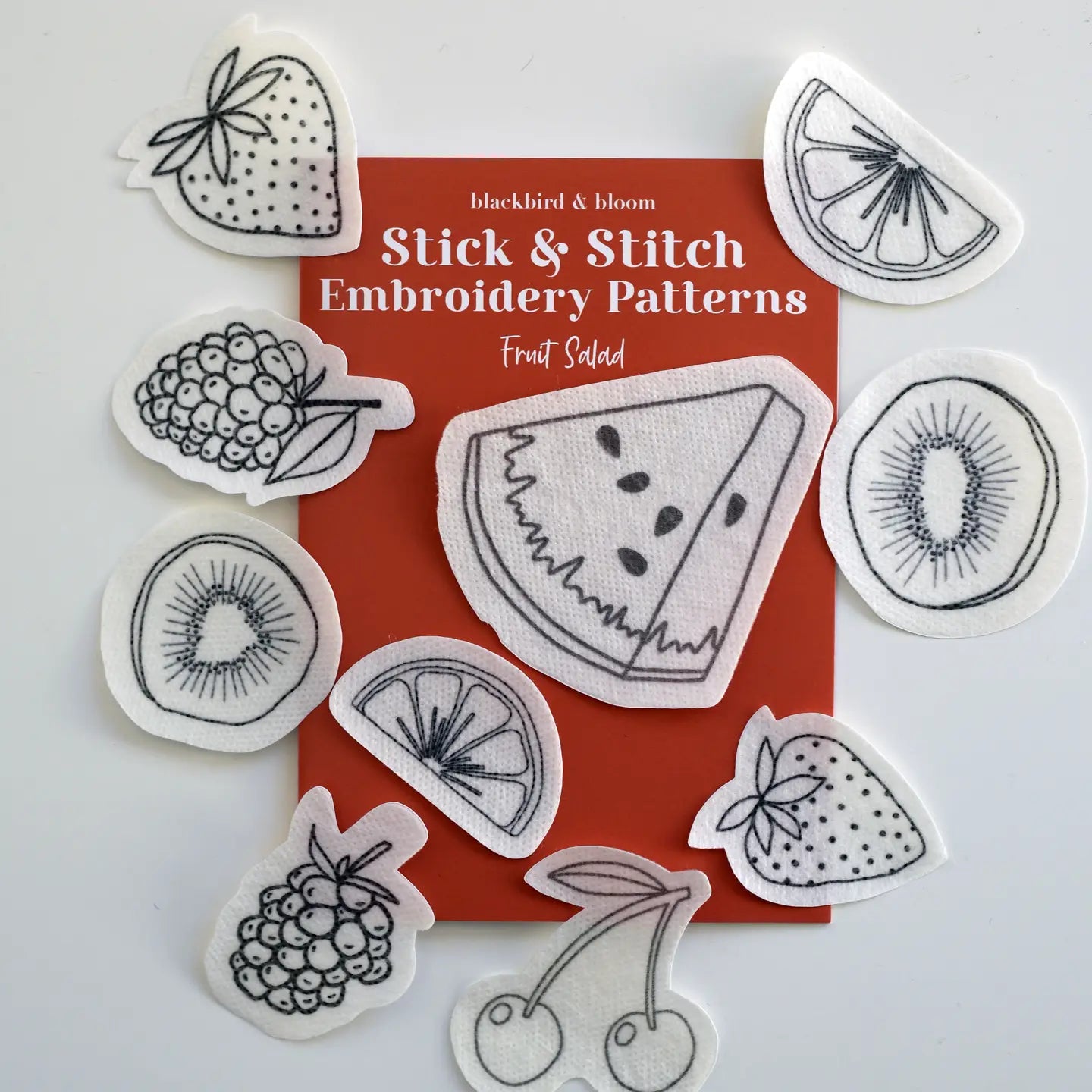 Each pack contains a selection of different illustrations printed on water-soluble fabric stabilizer. There are 8 stand-alone fabric stickers in this pack and an A6 card with an instruction guide.